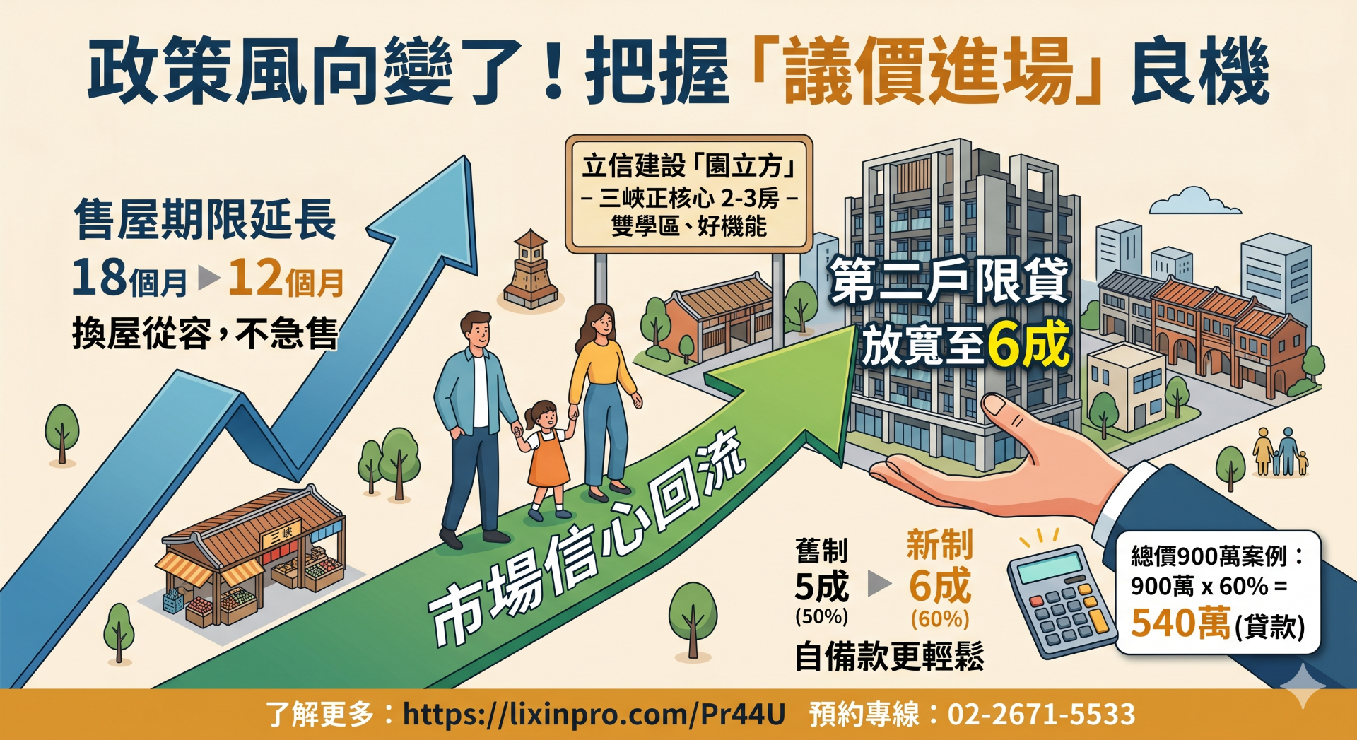 2026-04-222026-04-22 jonaan19 近期房市最具話題性的焦點,莫過於中央銀行將第二戶房貸成數由原本的5成提高至6成。從表面上來看,這僅有「1成」的變動看似微乎其微,卻引發社會高度關注與討論,不禁讓人納悶:既然有能力置產第二戶,真的會為了這1成的差距有那麼大的反應? 對此,有房市觀察家指出,關鍵不在於那1成的微幅利多,而是從中嗅到了政策轉向的氛圍「風向變了,市場信心可望逐步回溫。」另有一派觀點則認為,隨著央行態度轉趨溫和,一旦買氣信心回籠,房市有望重啟新一波的上漲動能,「對於自住客來說,現在可能是不錯的議價進場機會!」 「第二戶限貸」兩大鬆綁重點一次看 雖說「第二戶限貸放寬至6成」相關議題正熱,仍有許多人不清楚何為「第二戶限貸」?針對「先買後賣」的實質換屋需求,央行已正式公告「第二戶購屋貸款協處措施」,主要有2大鬆綁重點: 重點1、售屋期限延長,換屋更從容 出售舊屋期限由原本的1年延長至18個月,讓換屋族有更充裕的時間可以處理售屋事宜,有效緩解舊屋換新屋的急售壓力。 重點2、貸款成數調升,資金更彈性 將第二戶貸款成數由原本的5成提高至6成,有助於提升資產配置的靈活性,讓資金運用更具彈性與效率。 以下表格整理第二戶貸款成數新、舊制比較: 政策 舊制 新制 適用地區 特定地區(六都與新竹縣市) 全國不分地區 首購貸款成數 最高成數80%,有寬限期。 最高成數80%,有寬限期。 第二戶貸款成數 最高成數50%,無寬限期。 最高成數60%,無寬限期。 第三戶貸款成數 最高成數40%,無寬限期。 最高成數30%,無寬限期。 資料來源:中央銀行 舉例來說,假設小明在台北市擁有一套自住公寓並登記在其名下,另外打算在新北市購入總價900萬元的套房;依照目前的最新規定,第二戶購屋貸款最高成數為6成且不得有寬限期,最高可貸款金額:900萬元╳60%=540萬元(自備款:900萬元-540萬元=360萬元)。 以此類型物件為例,立信建設「園立方」坐擁雙學區資源、周邊涵蓋多所明星學校,並鄰近三峽老街與三峽公有市場,除了擁有良好的就學環境外,也享有完善的生活機能,無論日常採買、餐飲消費或休閒娛樂皆相當便利,加上整體環境單純、居住氛圍寧靜,對於有自住需求的購屋族而言,尤具吸引力。 置產首選推薦:立信建設【園立方】 黃金學區:明星學校為鄰,給孩子最好的起跑點。 核心機能:老街、市場走路就到,採買超方便。 純住質感:靜謐氛圍,2-3房規劃,最適合家庭升級。 預約專線:02-2671-5533 了解更多:https://lixinpro.com/Pr44U 【免責聲明】:本試算結果不代表銀行最終審核承諾,實際貸款條件(額度、利率)視申請人個別資產狀況而定。